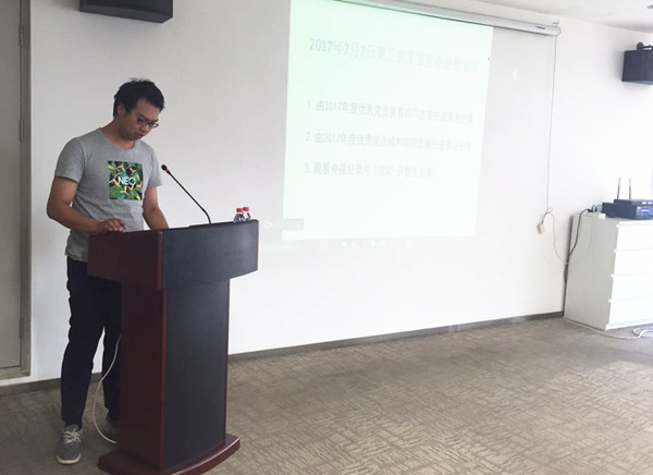 2017年7月7日上午10:00在中汽中心主樓七樓715會議室,由汽車工程研究院黨總支第三黨支部書記馬杰同志主持,2017年度優秀黨員吳春玲同志和端木瓊同志分別向第三黨支部24名參會黨員作了先進事跡分享。