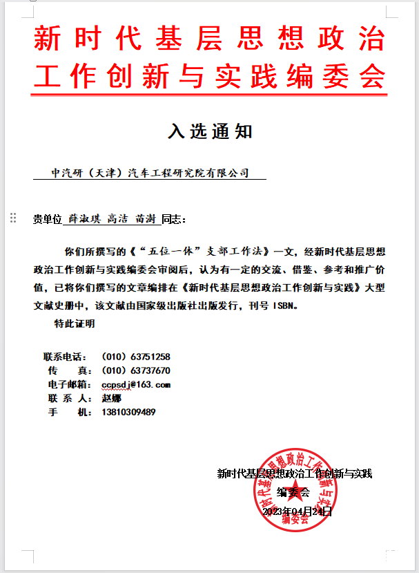 2023年以來,工程院黨委始終堅持以習(xí)近平新時代中國特色社會主義思想為指導(dǎo),以“破局而立·聚勢啟新”為總體黨建工作思路,破組織力不強之局、聚攻堅克難之勢;破品牌創(chuàng)效不實之局、聚雙融雙促之勢;破凝聚力不足之局、聚干事創(chuàng)業(yè)之勢,形成了“12357”黨建工作法,打造了“黨建搭臺、業(yè)務(wù)唱戲、文化賦能”的黨建經(jīng)營雙融雙促雙提升模式,獲評中汽中心2024年“紅旗黨委”榮譽稱號。同時,6人獲評優(yōu)秀共產(chǎn)黨員,3人獲評優(yōu)秀黨務(wù)工作者。
